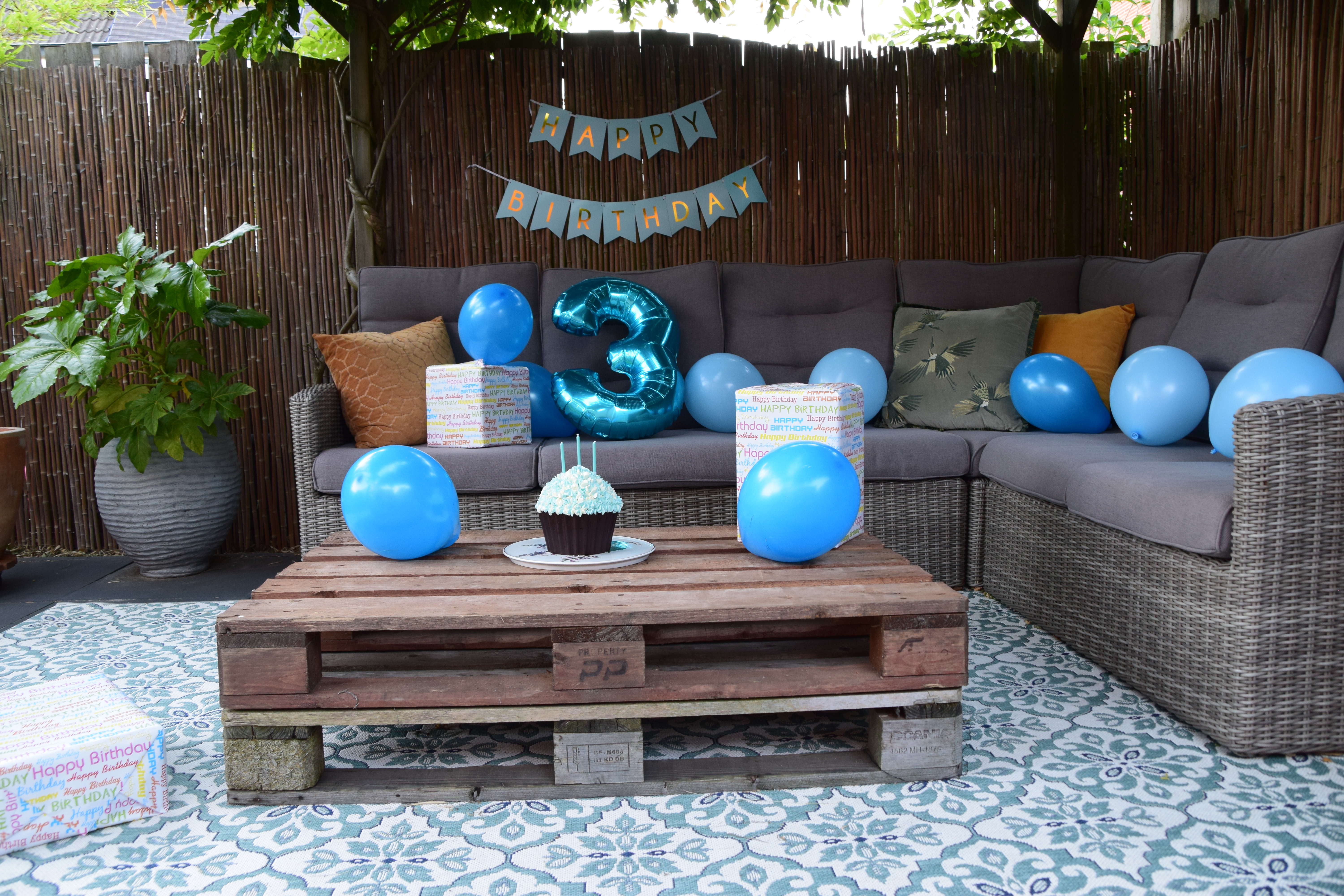 Voor die dag had ik zelf het huis en de tuin gestyled met ballonen en slingers. Ik heb  Ruben zelf de kleur laten kiezen en dat werd blauw. Ik koos voor een lichtblauwe slinger met gouden letters; “Happy Birthday”. Het witte lint zat erbij en heb ik door de helft geknipt, zodat ik de 2 woorden boven elkaar konden hangen. Anders werd de slinger te lang. Verder koos ik voor een grote, blauwe folieballon met het cijfer 3. De ballon is een meter hoog. Voor het cadeaupapier heb ik erop gelet dat de kleur blauw weer terug kwam. Zo werd alles een geheel. Het cadeaupapier kocht ik bij Kruidvat.